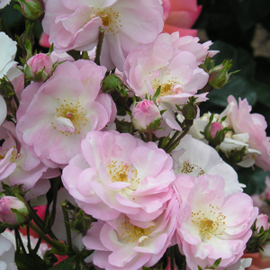 | En populär ros som kantväxt. Översållas med små dubbla blommor i stora klasar. Mycket svag doft. Trivs i soliga lägen men är förhållandevis skuggtålig. Breder ut sig ca 1-1,2 meter. |